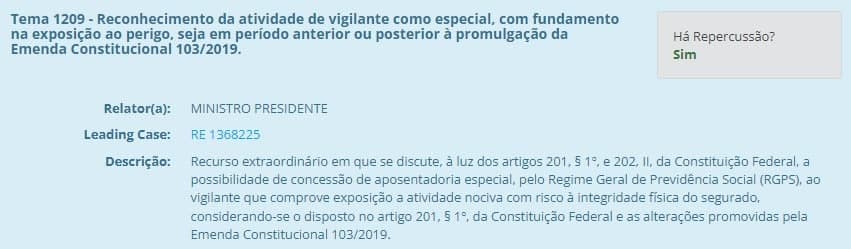 Aposentadoria Especial dos Vigilantes: STF reconhece repercussão geral do Tema 1.209