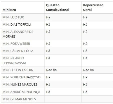 Quanto ao placar da votação, apenas o Ministro Edson Fachin votou contra o reconhecimento da repercussão geral. O Ministro Gilmar Mendes, por sua vez, deixou de se manifestar sobre o tema.