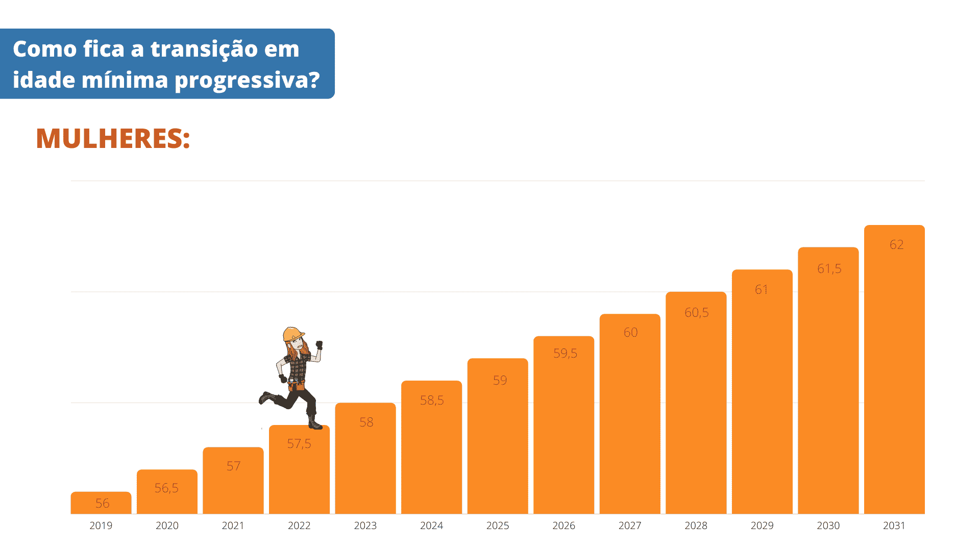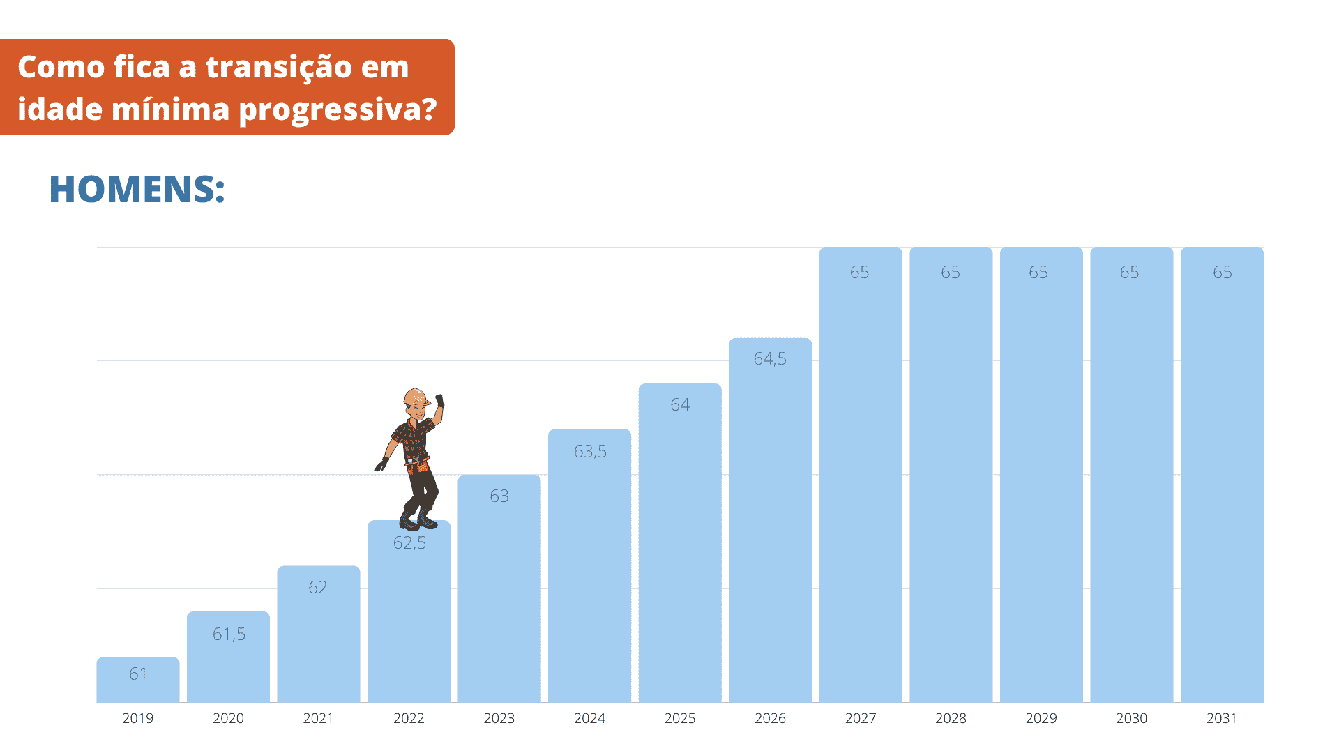 O requisito de idade será acrescido de 6 meses a cada ano, a partir de 01/01/2020, até atingir 62 anos para mulheres e 65 anos para homens, conforme o infográfico abaixo: