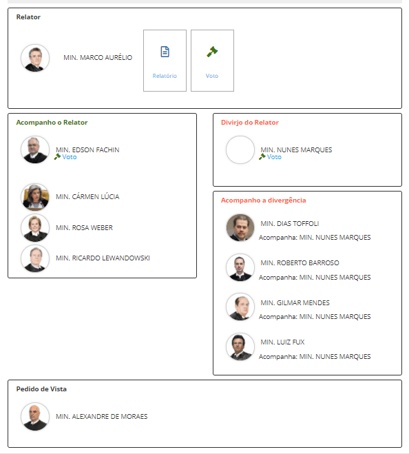 Ao passo que o relator, Ministro Marco Aurélio, apresentou voto favorável à tese, o Ministro Nunes Marques iniciou voto divergente.