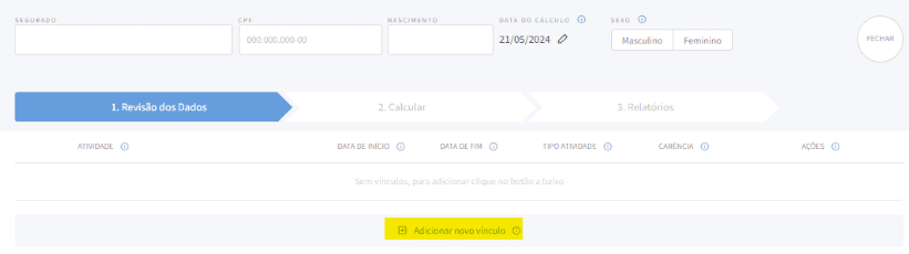 Caso deseje fazer um cálculo manual, ou seja, sem a utilização do CNIS digital, preencha os dados pessoais de seu cliente e, após, clique em “Adicionar novo vínculo” para informar as atividades laborativas do segurado.