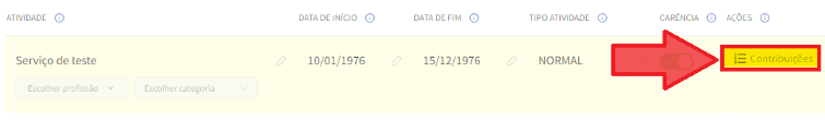 Aliás, se quiser conferir ou editar manualmente os salários de contribuição de uma ou mais competências, poderá fazê-lo acessando o botão de “Contribuições”, disponível em cada uma das linhas de atividades lançadas em seu cálculo:
