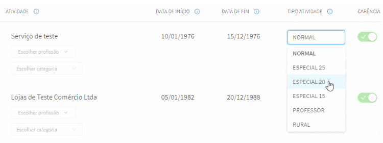 Para que o sistema identifique as atividades desenvolvidas em exposição a agentes nocivos é muito simples. Basta buscar o vínculo desejado e alterar o “TIPO DE ATIVIDADE” para “ESPECIAL”, seja, 15, 20 ou 25, de acordo com o labor exercido: