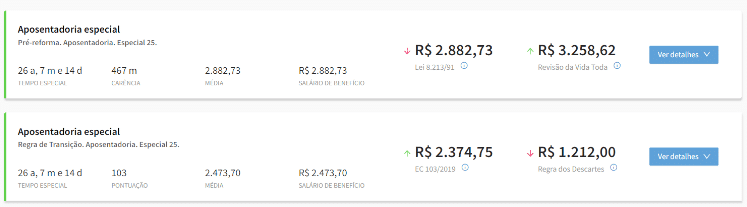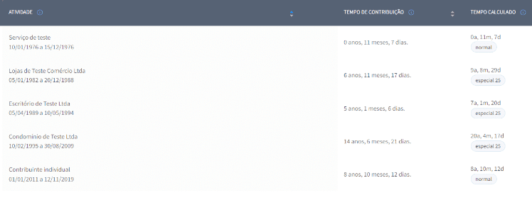 Assim, em apenas dois cliques você escolhe o tipo de atividade especial e o sistema automaticamente apresentará o cálculo com todas as possibilidades de Aposentadoria Especial e suas respectivas conversões nos benefícios de Aposentadoria por Tempo de Contribuição.