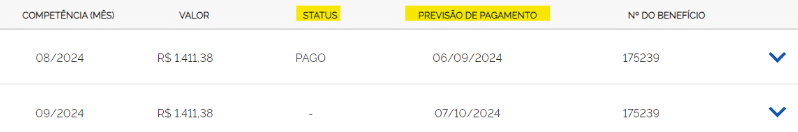 Na mesma página, clicando na seta azul para baixo, ao final da linha, você terá mais detalhes quanto ao pagamento, inclusive com os dados bancários para onde será depositado o valor do benefício: